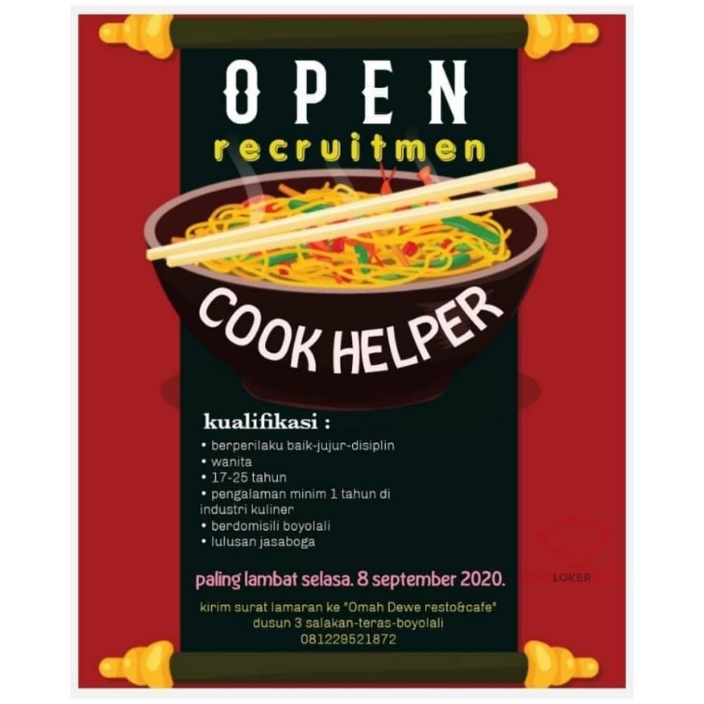 Lowongan pekerjaan Omah Dewe Cafe Resto di Solo untuk posisi cook helper berpengalaman. Peluang Kerja Omah Dewe Cafe Resto di Solo dengan keahlian bisa komunikatif untuk bekerjasama serta menguasai bidang bisnis kuliner. Lowongan Kerja Omah Dewe Cafe Resto di Solo untuk pria dan wanita domisili Surakarta dan sekitarnya. Segera kirim persyaratan lowongan pekerjaan ke Omah Dewe Cafe Resto di Solo. Info lebih lanjut Omah Dewe Cafe Resto di Solo berada di Salakan, Teras, Boyolali atau hubungi melalui telepon 0812-2952-1872 .