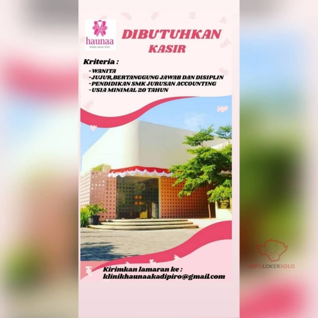 Lowongan pekerjaan Klinik Haunaa Kadipiro Solo untuk posisi kasir berpengalaman. Peluang Kerja Klinik Haunaa Kadipiro Solo dengan keahlian bisa komunikatif untuk bekerjasama serta menguasai bidang kesehatan. Lowongan Kerja Klinik Haunaa Kadipiro Solo untuk wanita domisili Surakarta dan sekitarnya. Segera kirim persyaratan lowongan pekerjaan ke Klinik Haunaa Kadipiro Solo. Info lebih lanjut Klinik Haunaa Kadipiro Solo hubungi melalui email: klinikhaunaa@gmail.com .