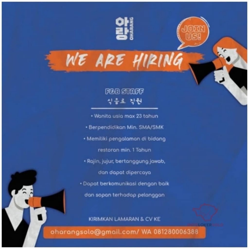 Lowongan pekerjaan Oharang Resto di Solo untuk posisi Food and Beverage berpengalaman. Peluang Kerja Oharang Resto di Solo dengan keahlian bisa komunikatif untuk bekerjasama serta menguasai bidang bisnis kuliner. Lowongan Kerja Oharang Resto di Solo untuk wanita domisili Surakarta dan sekitarnya. Segera kirim persyaratan lowongan pekerjaan ke Oharang Resto di Solo. Info lebih lanjut Oharang Resto di Solo hubungi melalui whatsapp 0812-8000-6388 serta hubungi melalui email : oharangsolo@gmail.com .