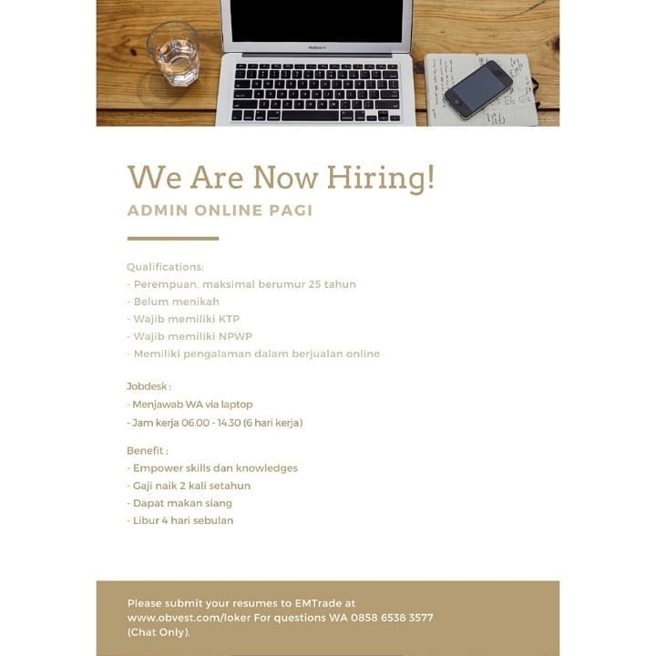 Lowongan pekerjaan EMTrade di Solo untuk posisi Admin Online Pagi berpengalaman, Admin Online Malam berpengalaman dan Human Resource berpengalaman di Solo. Peluang Kerja EMTrade di Solo dengan keahlian bisa komunikatif untuk bekerjasama serta menguasai bidang lembaga keuangan. Lowongan Kerja EMTrade di Solo untuk pria dan wanita domisili Surakarta dan sekitarnya. Segera kirim persyaratan lowongan pekerjaan ke EMTrade di Solo Info lebih lanjut EMTrade di Solo hubungi melalui whatsapp 0858-6538-3577 ( chat only ).
