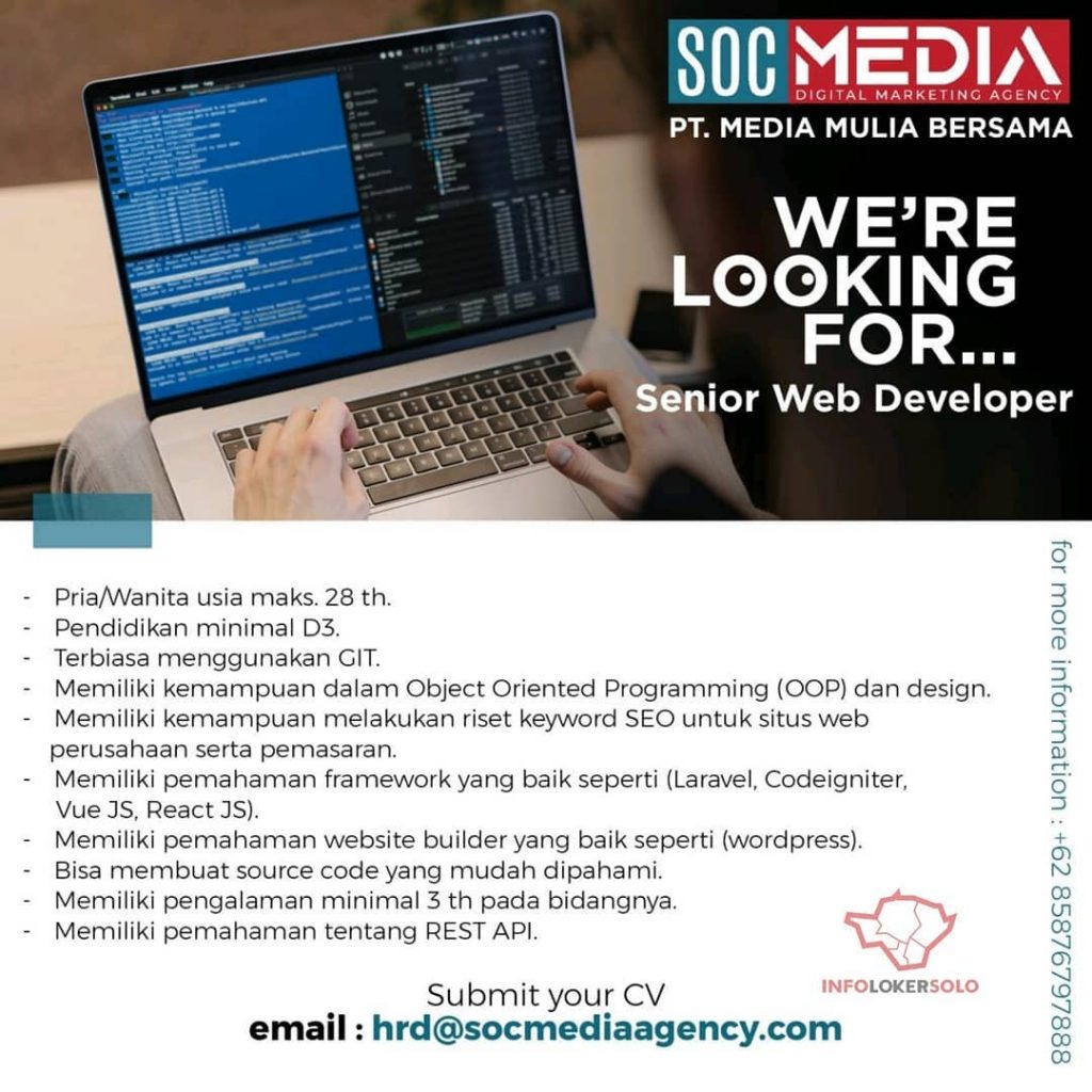 Lowongan pekerjaan SOC Media Agency di Solo untuk posisi Senior Web Developer berpengalaman dan Account Executive berpengalaman. Peluang Kerja Team SOC Media Agency di Solo dengan keahlian bisa komunikatif untuk bekerjasama serta menguasai bidang bisnis digital. Lowongan Kerja Team SOC Media Agency di Solo untuk pria dan wanita domisili Surakarta dan sekitarnya. Segera kirim persyaratan lowongan pekerjaan ke SOC Media Agency di Solo. Info lebih lanjut SOC Media Agency di Solo hubungi melalui email: hrd@socmediaagency.com .