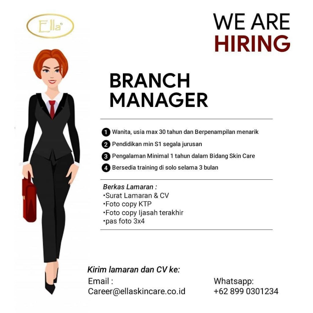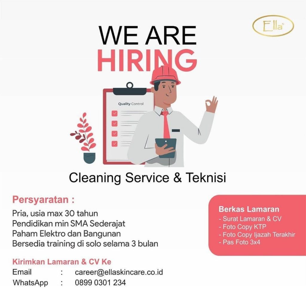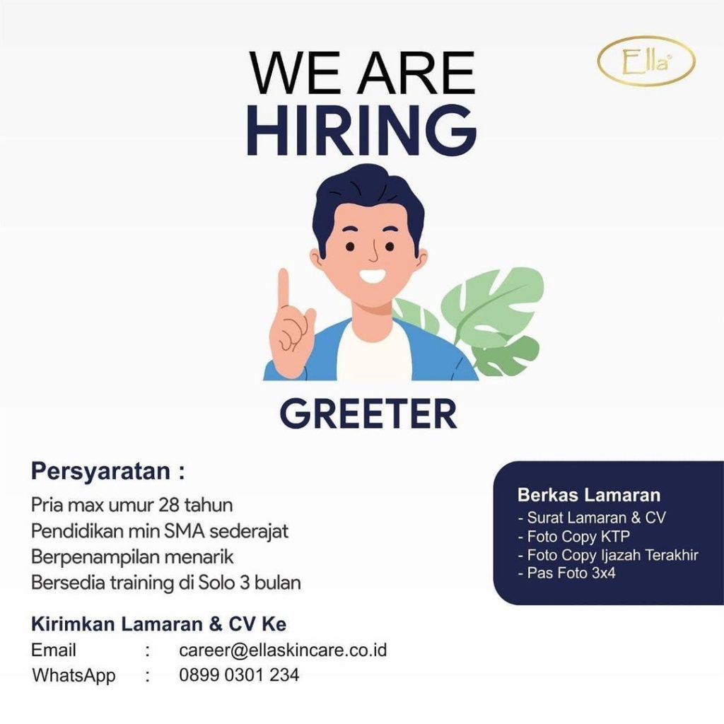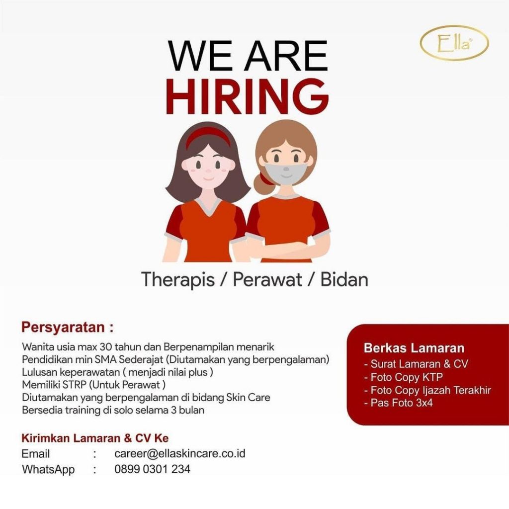 Lowongan pekerjaan Ella Skin Care di Solo untuk Dokter berpengalaman, Greeter bepengalaman, Cleaning Service berpengalaman, Teknisi berpengalaman, Reseller Experience berpengalaman dan Branch Manager bepengalaman. Peluang Kerja Team Ella Skin Care di Solo dengan keahlian bisa komunikatif untuk bekerjasama serta menguasai bidang bisnis kecantikan. Lowongan Kerja Team Ella Skin Care di Solo untuk pria atau wanita domisili Surakarta dan sekitarnya. Segera kirim persyaratan lowongan pekerjaan ke Ella Skin Care di Solo. Info lebih lanjut Ella Skin Care di Solo hubungi melalui email: career@ellaskincare.co.id dan hubungi melalui whatsapp 0899-0301-234.