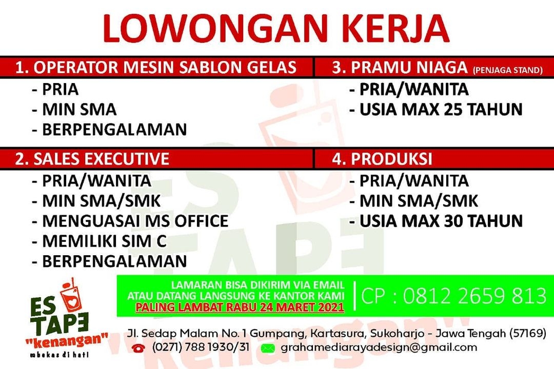 Sudah cek info Lowongan Kerja Crew Es Tape Kenangan di Solo? Lowongan Kerja bisnis kuliner di Solo. Cari info loker…