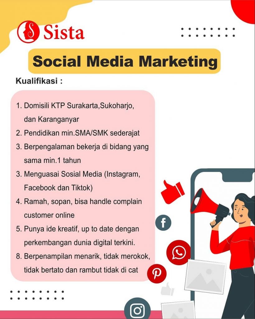 Lowongan pekerjaan Toko Sista di Solo untuk posisi Staff Accounting berpengalaman, dan Social Media Marketing berpengalaman. Peluang Kerja Super Team Toko Sista di Solo dengan keahlian bisa komunikatif untuk bekerjasama serta menguasai bidang bisnis fashion. Lowongan Kerja Super Team Toko Sista di Solo untuk pria atau wanita domisili Surakarta dan sekitar. Segera kirim persyaratan lowongan pekerjaan ke Toko Sista di Solo. Info lebih lanjut Toko Sista di Solo hubungi melalui email: hrd.sistagroup@gmail.com .