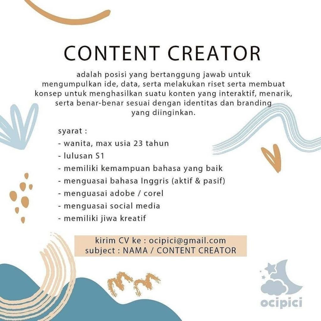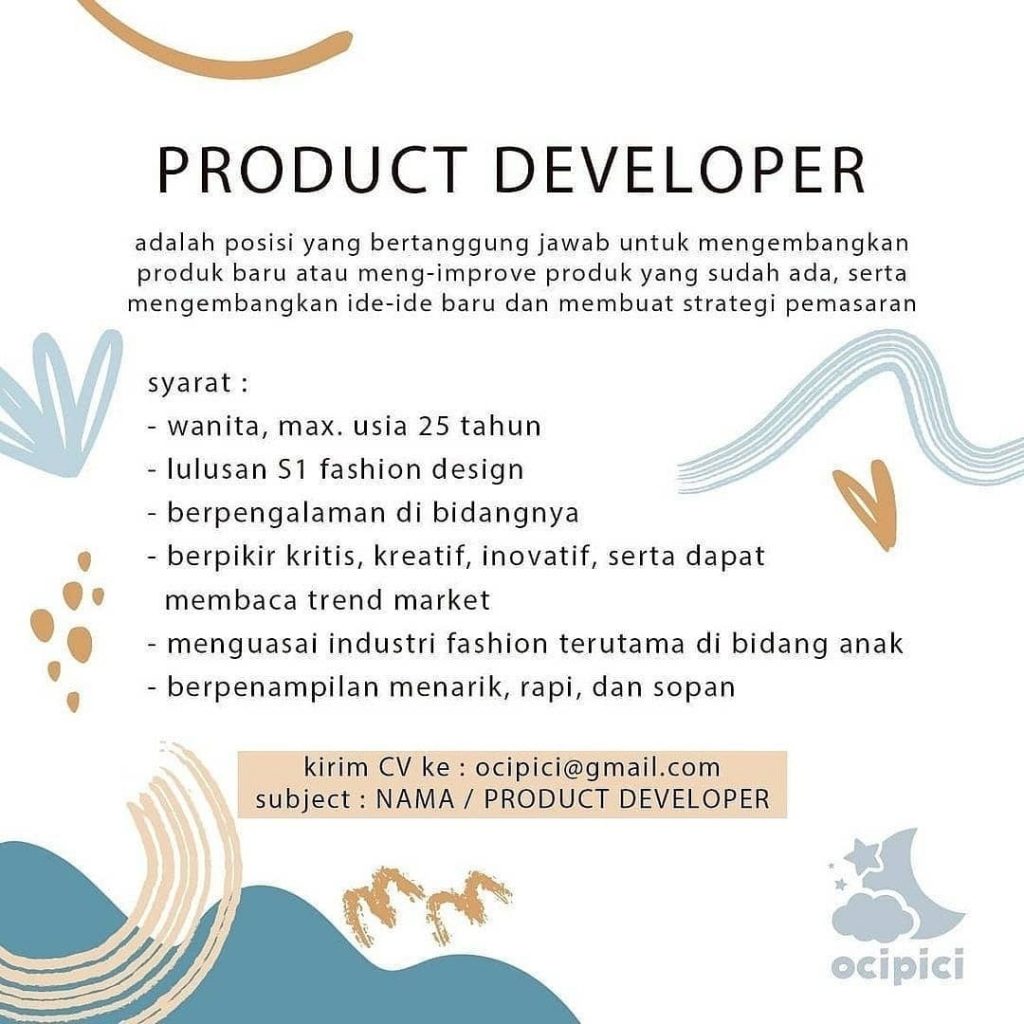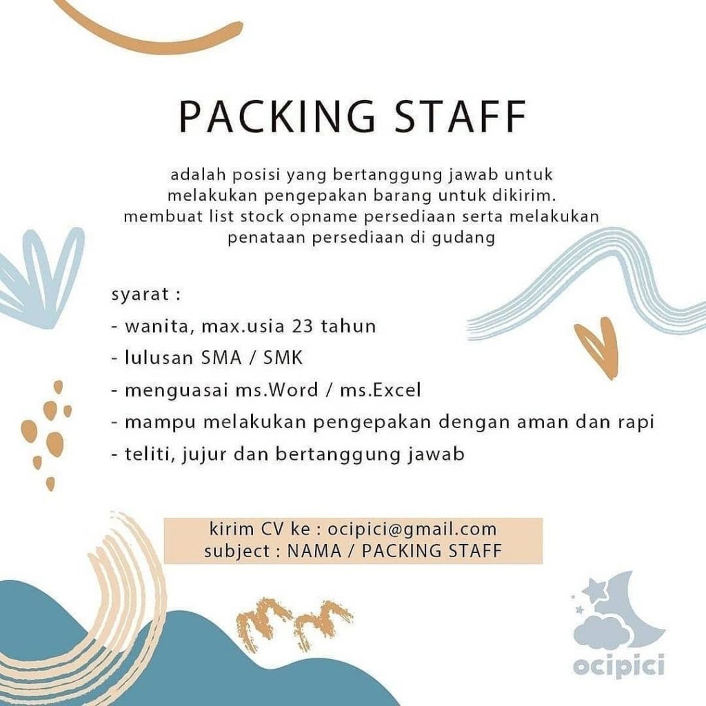 Lowongan pekerjaan Ocipici di Solo untuk posisi Product Developer berpengalaman, Content Creator berpengalaman dan Packing Staff berpengalaman. Peluang Kerja Manajemen Ocipici di Solo dengan keahlian bisa komunikatif untuk bekerjasama serta menguasai bidang bisnis fashion. Lowongan Kerja Manajemen Ocipici di Solo untuk pria atau wanita domisili Surakarta dan sekitar. Segera kirim persyaratan lowongan pekerjaan ke Ocipici di Solo. Info lebih lanjut Manajemen Ocipici di Solo hubungi melalui email : ocipici@gmail.com .