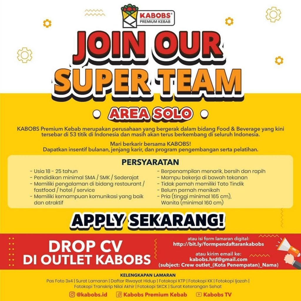 Sudah cek info Lowongan Kerja Super Team Outlet Kabobs Area Solo? Lowongan Kerja bisnis kuliner di Solo. Cari info loker solo terbaru ? Cek sekarang juga….