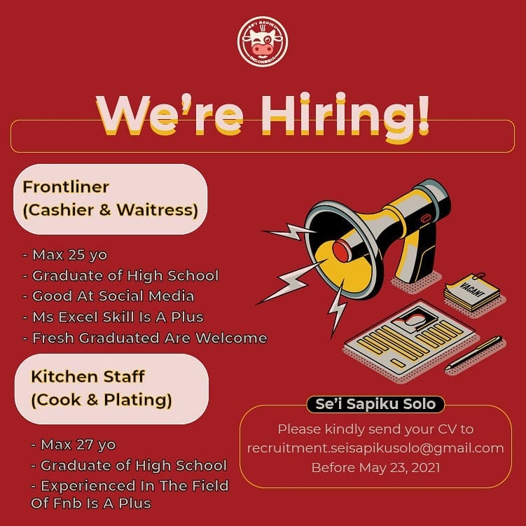 Sudah cek info Lowongan Kerja Team Sei Sapiku Solo? Lowongan Kerja bisnis kuliner di Solo. Cari info loker solo terbaru…