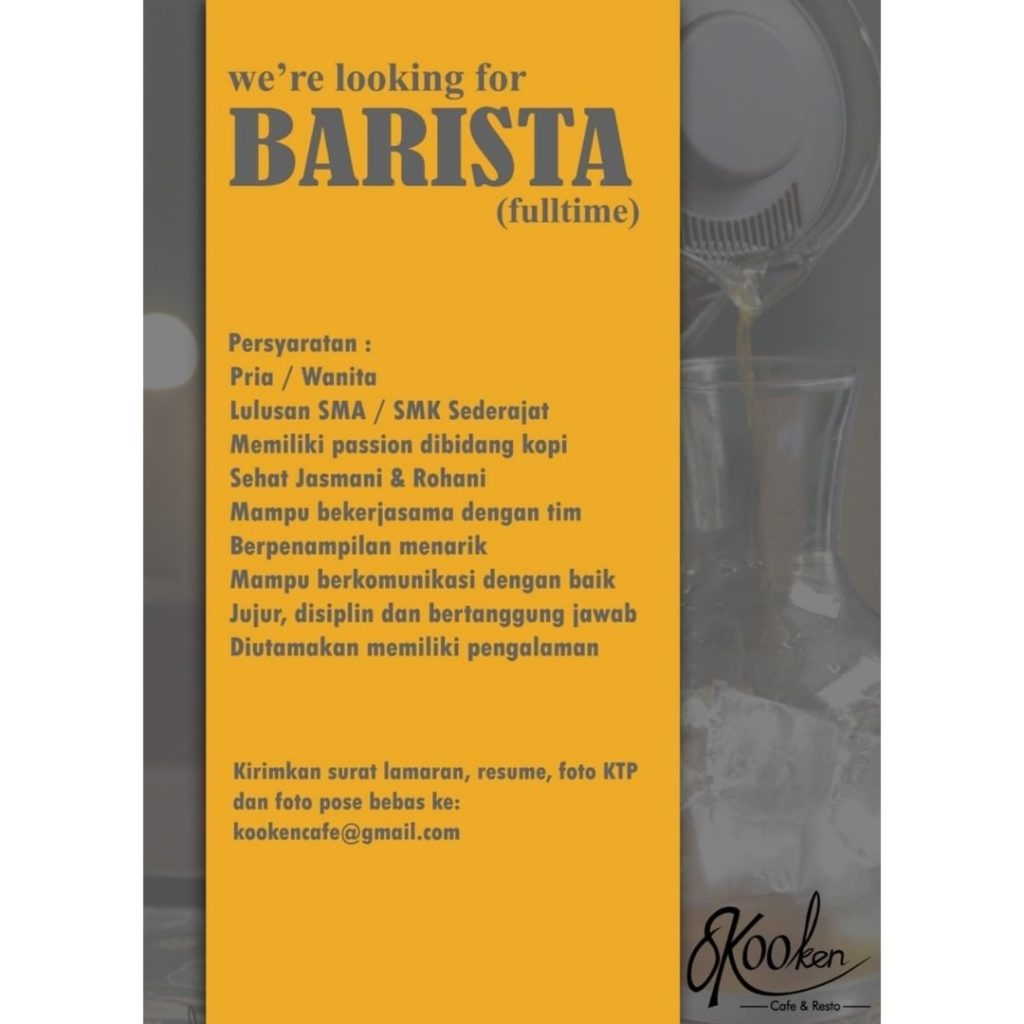 Lowongan pekerjaan Kooken Cafe and Resto di Solo untuk Barista berpengalaman. Peluang Kerja Fulltime Barista Kooken Solo dengan keahlian bisa komunikatif untuk bekerjasama serta menguasai bidang bisnis kuliner. Lowongan Kerja Fulltime Barista Kooken Solo untuk pria atau wanita domisili Surakarta dan sekitarnya. Segera kirim persyaratan lowongan pekerjaan ke Kooken Cafe and Resto di Solo. Info lebih lanjut Kooken Cafe and Resto di Solo hubungi melalui email: kookencafe@gmail.com .