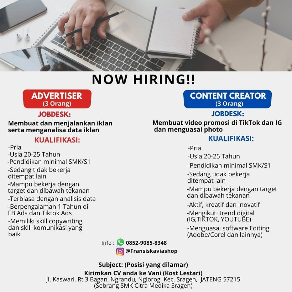 Lowongan pekerjaan Online Shop Fransiskavia Sragen untuk posisi Advertiser berpengalaman, Content Creator berpengalaman. Peluang Kerja Team Digital Online Shop di Sragen dengan keahlian bisa komunikatif untuk bekerjasama serta menguasai bidang bisnis fashion. Lowongan Kerja Team Digital Online Shop di Sragen untuk pria atau wanita domisili Surakarta dan sekitar. Segera kirim persyaratan lowongan pekerjaan ke Online Shop Fransiskavia Sragen. Info lebih lanjut Team Digital Online Shop di Sragen hubungi melalui telepon 0852-9085-8348.