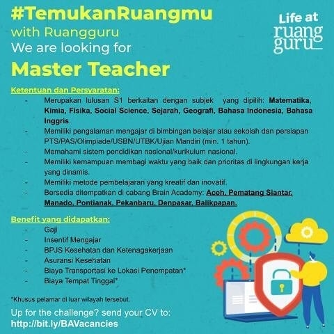 Lowongan pekerjaan Brain Academy Ruangguru untuk Master Teacher berpengalaman. Peluang Kerja Master Teacher Brain Academy Ruangguru dengan keahlian bisa komunikatif untuk bekerjasama serta menguasai bidang pendidikan. Lowongan Kerja Master Teacher Brain Academy Ruangguru untuk pria atau wanita domisili Surakarta dan sekitarnya. Segera kirim persyaratan lowongan pekerjaan ke Brain Academy Ruangguru. Info lebih lanjut Master Teacher Brain Academy Ruangguru hubungi melalui whatsapp only Regi 0813-1693-8651.