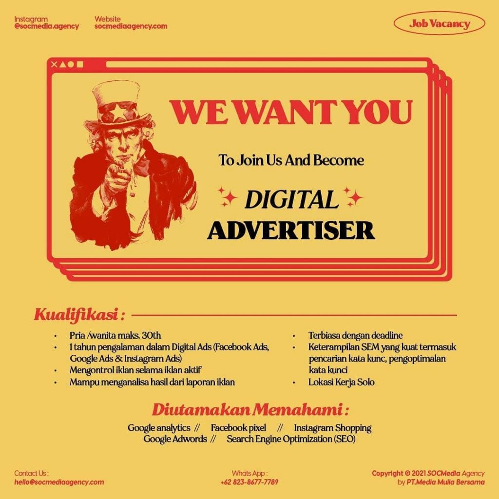 Sudah cek info Lowongan Kerja Digital Advertiser SOC Media Agency? Lowongan Kerja bisnis jasa di Solo. Cari info loker solo terbaru ? Cek sekarang juga….