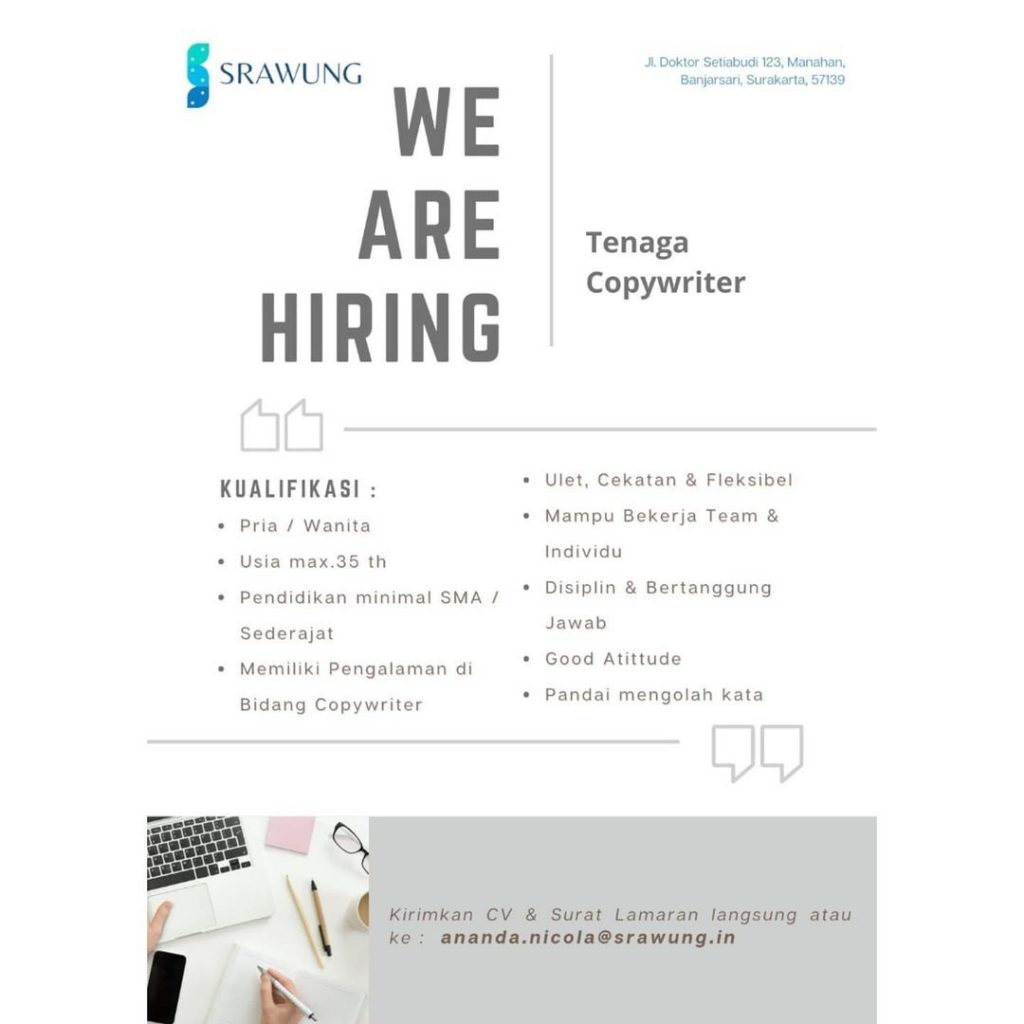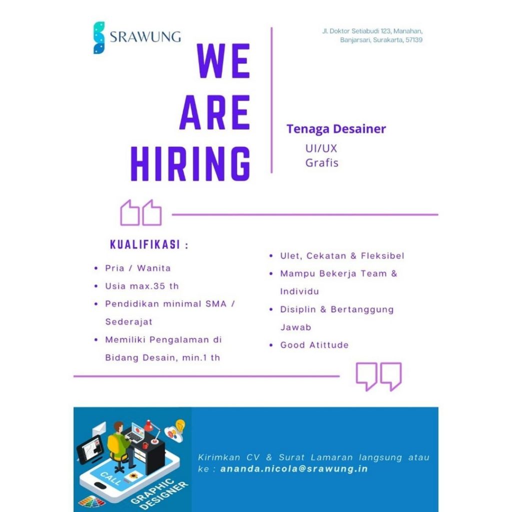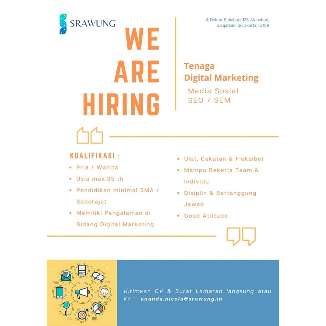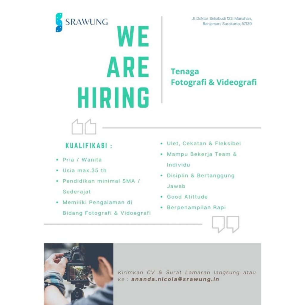 Lowongan pekerjaan Perusahaan Srawung In di Solo untuk Digital Marketing berpengalaman, Designer berpengalaman, Copywriter berpengalaman, IT berpengalaman, Fotografer berpengalaman, Videografer berpengalaman. Peluang Kerja Team Perusahaan Srawung In di Solo dengan keahlian bisa komunikatif untuk bekerjasama serta menguasai bidang bisnis jasa. Lowongan Kerja Team Perusahaan Srawung In di Solo untuk pria atau wanita domisili Surakarta dan sekitarnya. Segera kirim persyaratan lowongan pekerjaan ke Srawung In di Solo. Info lebih lanjut Team Perusahaan Srawung In di Solo hubungi melalui email Ananda.nicola@srawung.in .