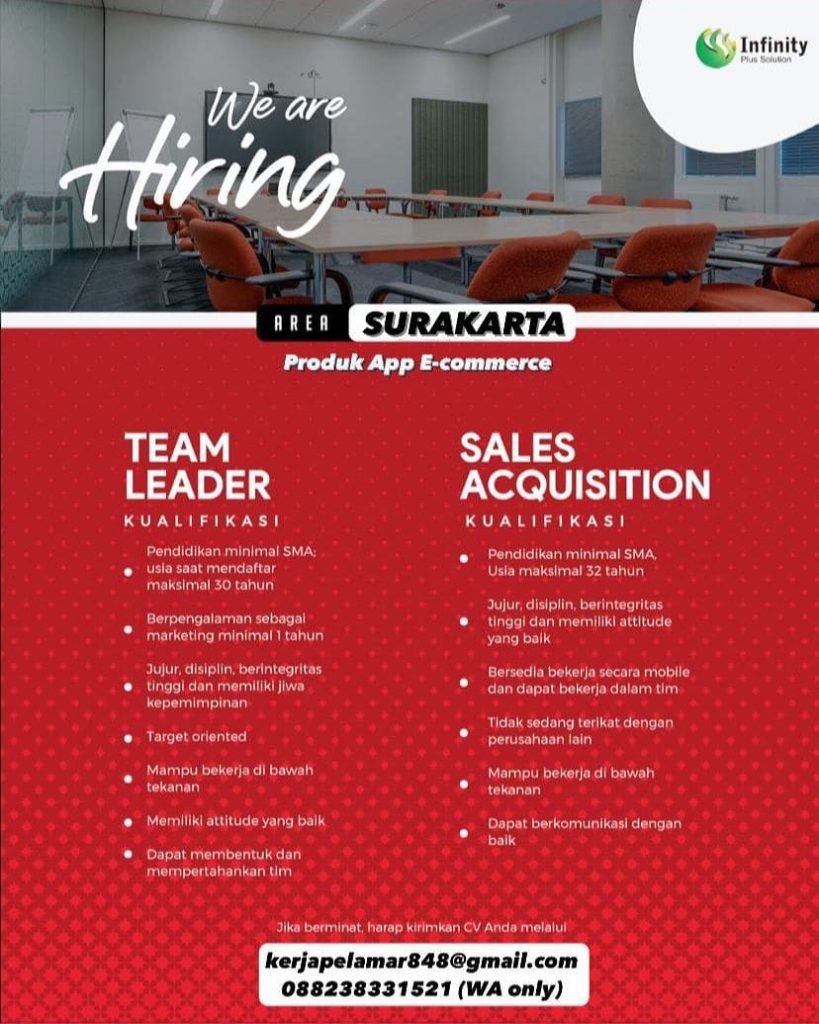 Lowongan pekerjaan PT Infinity Plus Solution untuk Team Leader berpengalaman, Sales Acquisition berpengalaman. Peluang Kerja Team Sales Produk Aplikasi E-commerce PT Infinity Plus Solution dengan keahlian bisa komunikatif untuk bekerjasama serta menguasai bidang bisnis jasa. Lowongan Kerja Team Sales Produk Aplikasi E-commerce PT Infinity Plus Solution untuk pria atau wanita domisili Surakarta dan sekitarnya. Segera kirim persyaratan lowongan pekerjaan ke PT Infinity Plus Solution di Solo. Info lebih lanjut Team Sales Produk Aplikasi E-commerce PT Infinity Plus Solution di Solo hubungi melalui telepon 0882-3833-1521 atau hubungi melalui email: kerjapelamar848@gmail.com .