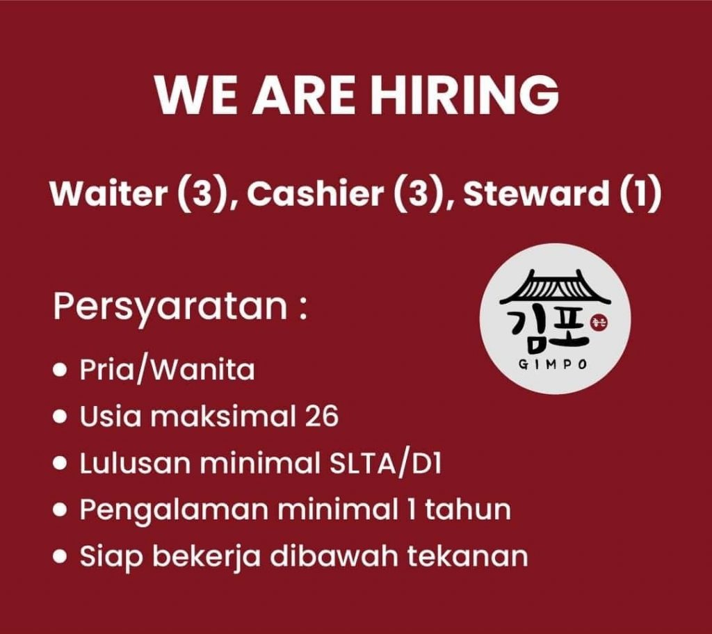 Lowongan pekerjaan Gimpo Korean Street Food di Solo untuk Waiter berpengalaman, Cashier berpengalaman, Steward berpengalaman, Content Creator berpengalaman, Social Media Management berpengalaman. Peluang Kerja Team Gimpo Korean Street Food di Solo dengan keahlian bisa komunikatif untuk bekerjasama serta menguasai bidang bisnis kuliner. Lowongan Kerja Team Gimpo Korean Street Food di Solo untuk pria atau wanita domisili Surakarta dan sekitarnya. Segera kirim persyaratan lowongan pekerjaan ke Gimpo Korean Street Food di Solo. Info lebih lanjut Team Gimpo Korean Street Food di Solo hubungi melalui email: tanakafoodgroup@gmail.com .