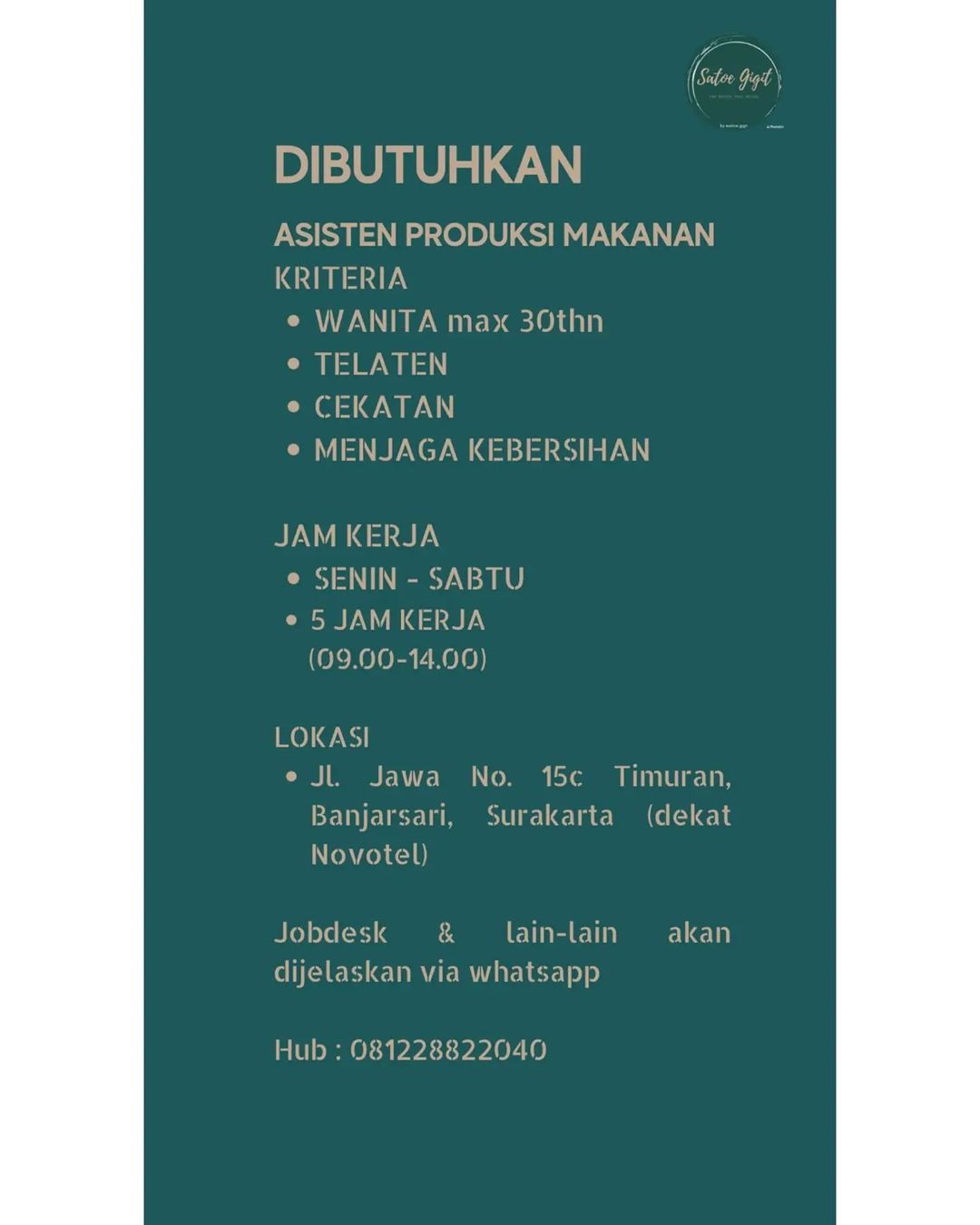 Sudah cek info Lowongan Kerja Asisten Produksi Makanan Satoe Gigit di Solo? Lowongan Kerja bisnis kuliner di Solo. Cari info…