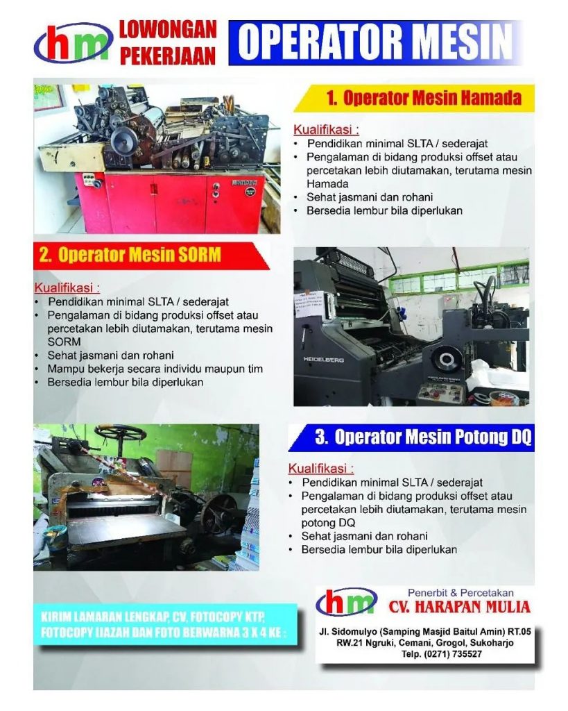 ? Loker Operator Mesin CV. Harapan Mulia di Solo