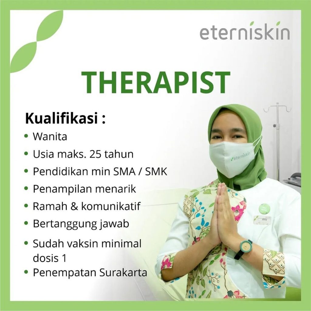 Lowongan pekerjaan Klinik Eterniskin di Solo untuk Therapist berpengalaman, Front Office berpengalaman. Peluang Kerja Team Klinik Eterniskin di Solo dengan keahlian bisa komunikatif untuk bekerjasama serta menguasai bidang bisnis kecantikan. Lowongan Kerja Team Klinik Eterniskin di Solo untuk wanita domisili Surakarta dan sekitarnya. Segera kirim persyaratan lowongan pekerjaan ke Klinik Eterniskin di Solo. Info lebih lanjut Team Klinik Eterniskin di Solo hubungi melalui email: rekrutmen@eterniskin.co.id .