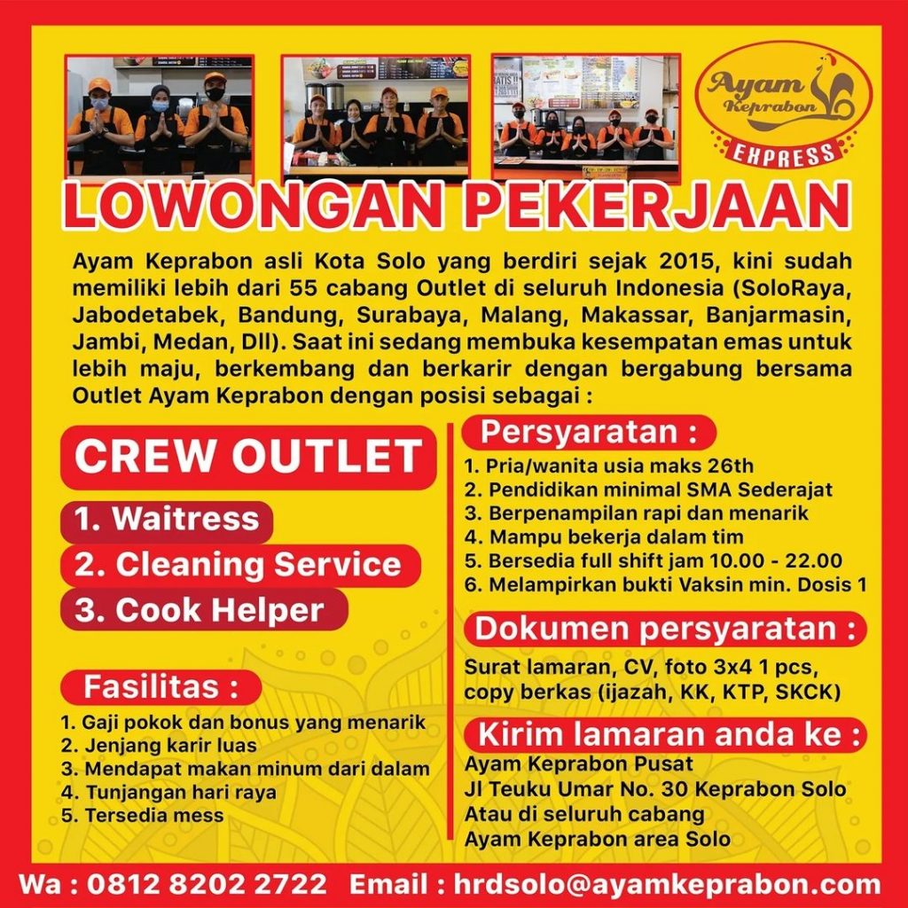 Sudah cek info Lowongan Kerja Crew Outlet 2022 Ayam Keprabon Pusat? Lowongan Kerja bisnis kuliner di Solo. Cari info loker solo terbaru ? Cek sekarang juga….