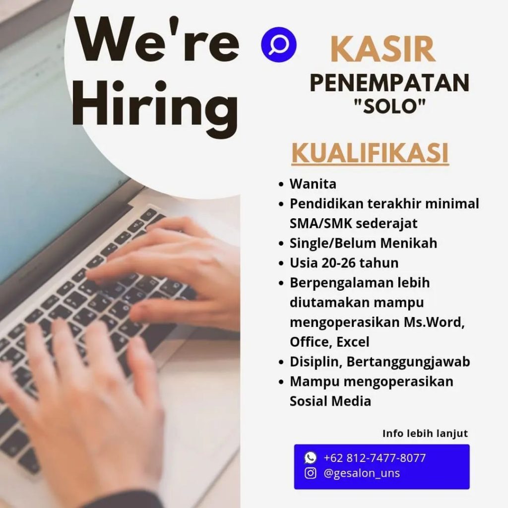 Lowongan pekerjaan 2022 Gesalon UNS Solo untuk Kasir berpengalaman. Peluang Kerja 2022 Kasir Wanita Gesalon UNS Solo dengan keahlian bisa komunikatif untuk bekerjasama serta menguasai bidang bisnis kecantikan. Lowongan Kerja 2022 Kasir Wanita Gesalon UNS Solo untuk wanita domisili Surakarta dan sekitarnya. Segera kirim persyaratan lowongan pekerjaan ke Gesalon UNS Solo. Info lebih lanjut 2022 Kasir Wanita Gesalon UNS hubungi melalui whatsapp 0812-7477-8077.