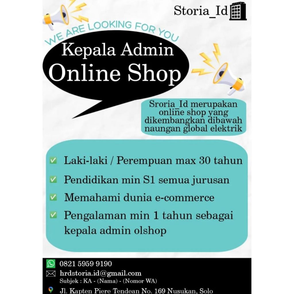 Lowongan pekerjaan 2022 Online Shop StoriaID di Solo untuk posisi Kepala Admin berpengalaman. Peluang Kerja 2022 Online Shop StoriaID di Solo dengan keahlian bisa komunikatif untuk bekerjasama serta menguasai bidang bisnis toko. Lowongan Kerja 2022 Online Shop StoriaID di Solo untuk pria atau wanita domisili Surakarta dan sekitar. Segera kirim persyaratan lowongan pekerjaan ke Online Shop StoriaID di Solo. Info lebih lanjut 2022 Online Shop StoriaID di Solo hubungi melalui email: hrdstoria.id@gmail.com .