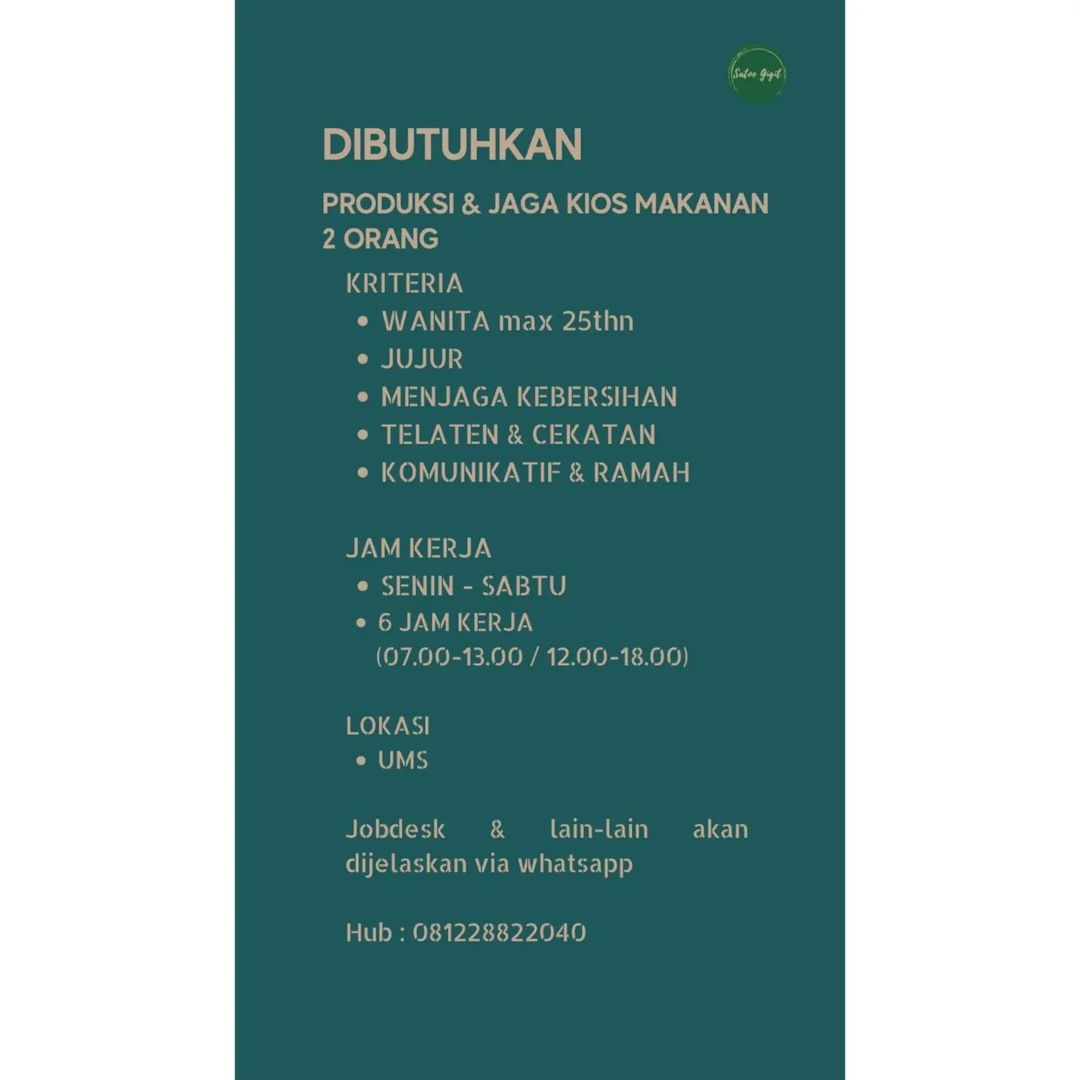 Sudah cek info Lowongan Kerja 2022 Crew Outlet Kios Makanan di UMS Solo? Lowongan Kerja bisnis kuliner di Solo. Cari info loker solo terbaru ? Cek sekarang juga….
