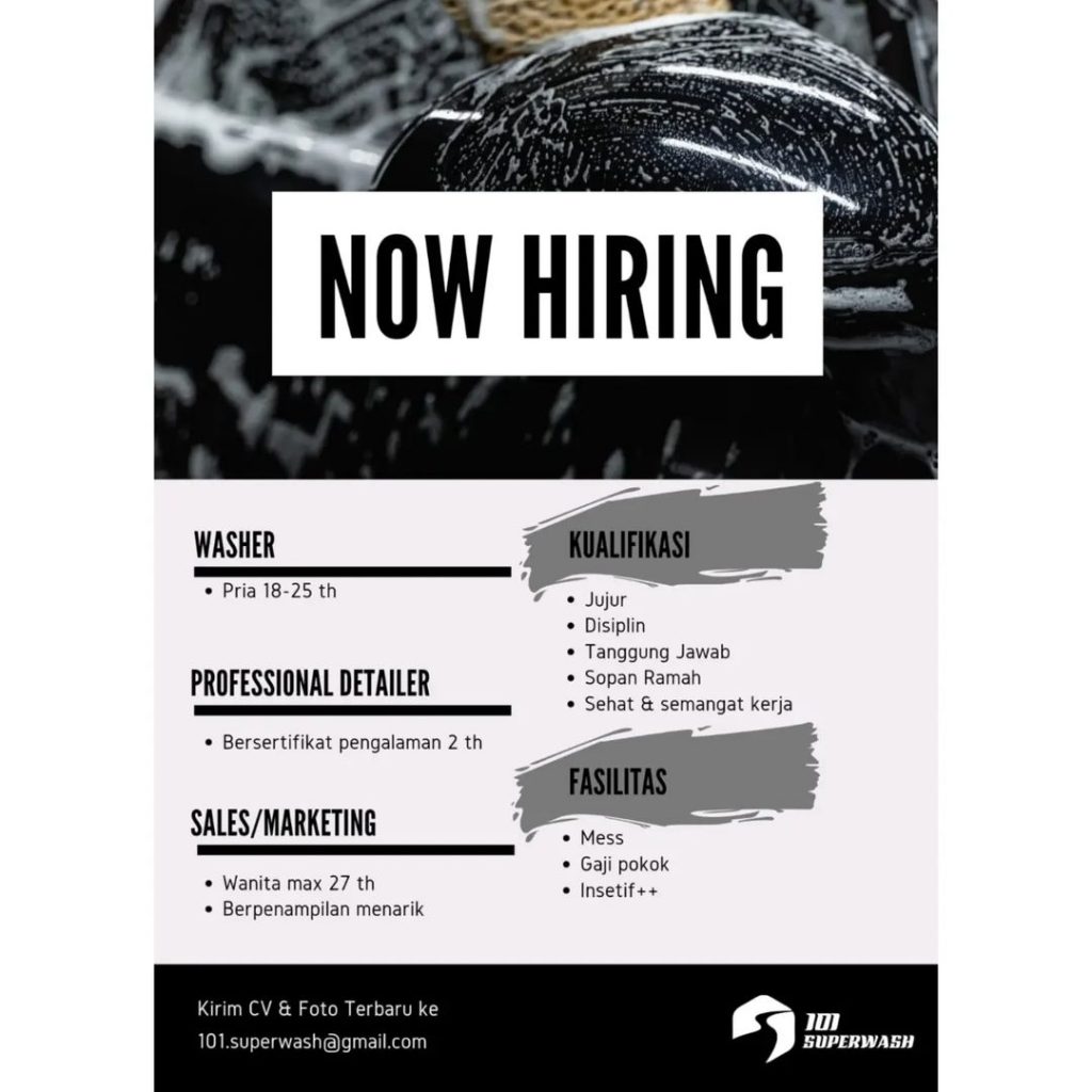 Lowongan pekerjaan 2022 101 Super Wash di Solo untuk Washer berpengalaman, Profesional Detailer berpengalaman. Peluang Kerja 2022 101 Super Wash di Solo dengan keahlian bisa komunikatif untuk bekerjasama serta menguasai bidang bisnis jasa cuci mobil. Lowongan Kerja 2022 101 Super Wash di Solo untuk pria atau wanita domisili Surakarta dan sekitarnya. Segera kirim persyaratan lowongan pekerjaan ke 101 Super Wash di Solo. Info lebih lanjut 2022 101 Super Wash di Solo hubungi email: 101.superwash@gmail.com .