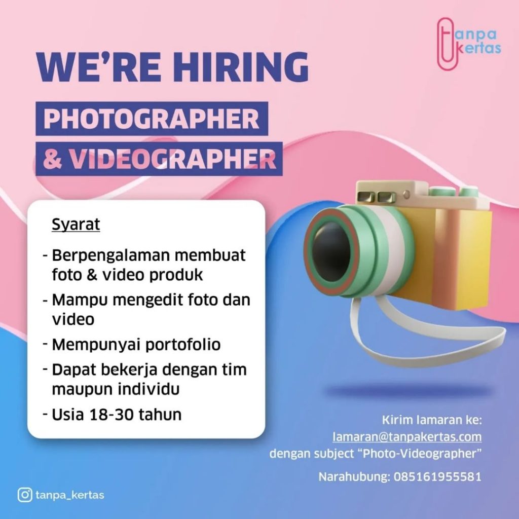 Lowongan pekerjaan 2022 Tanpa Kertas di Solo untuk Team Marketing berpengalaman, Photographer berpengalaman, Videographer berpengalaman. Peluang Kerja 2022 Team Tanpa Kertas di Solo dengan keahlian bisa komunikatif untuk bekerjasama serta menguasai bidang bisnis jasa. Lowongan Kerja 2022 Team Tanpa Kertas di Solo untuk pria atau wanita domisili Surakarta dan sekitarnya. Segera kirim persyaratan lowongan pekerjaan ke Tanpa Kertas di Solo. Info lebih lanjut 2022 Team Tanpa Kertas di Solo hubungi melalui email: lamaran@tanpakertas.com .