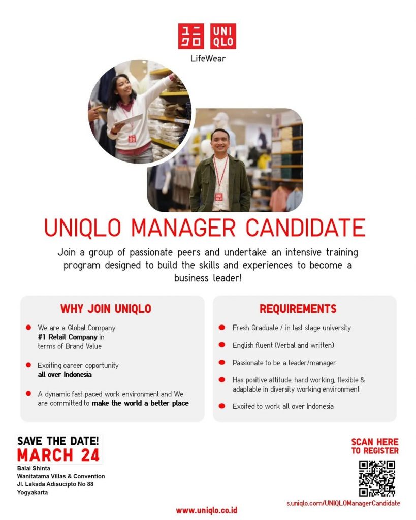 Pastikan kamu register terlebih dahulu di link berikut ini: https://s.uniqlo.com/UNIQLOManagerCandidate