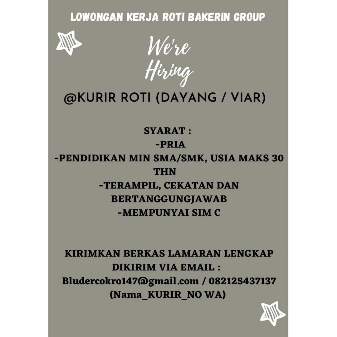 Sudah cek info Lowongan Kerja Mei 2022 Kurir Roti Bakerin Group? Lowongan Kerja bisnis kuliner di Solo. Cari info loker…