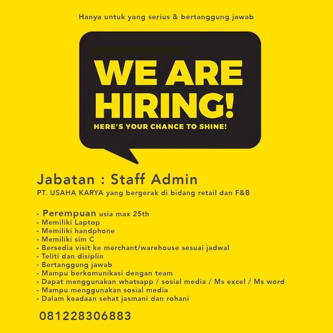 Sudah cek info Lowongan Kerja Mei 2022 Staff Admin PT Usaha Karya? Lowongan Kerja bisnis kuliner di Solo. Cari info…