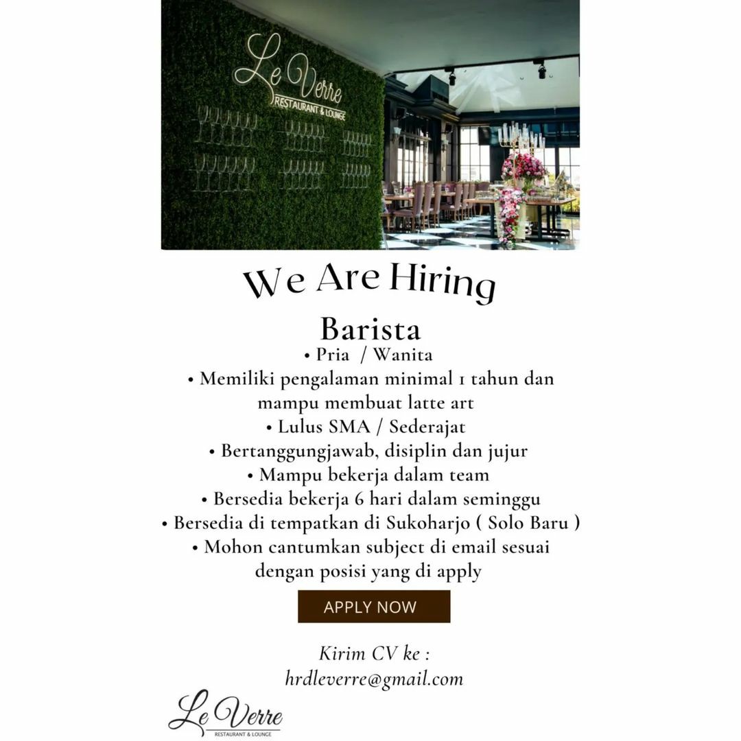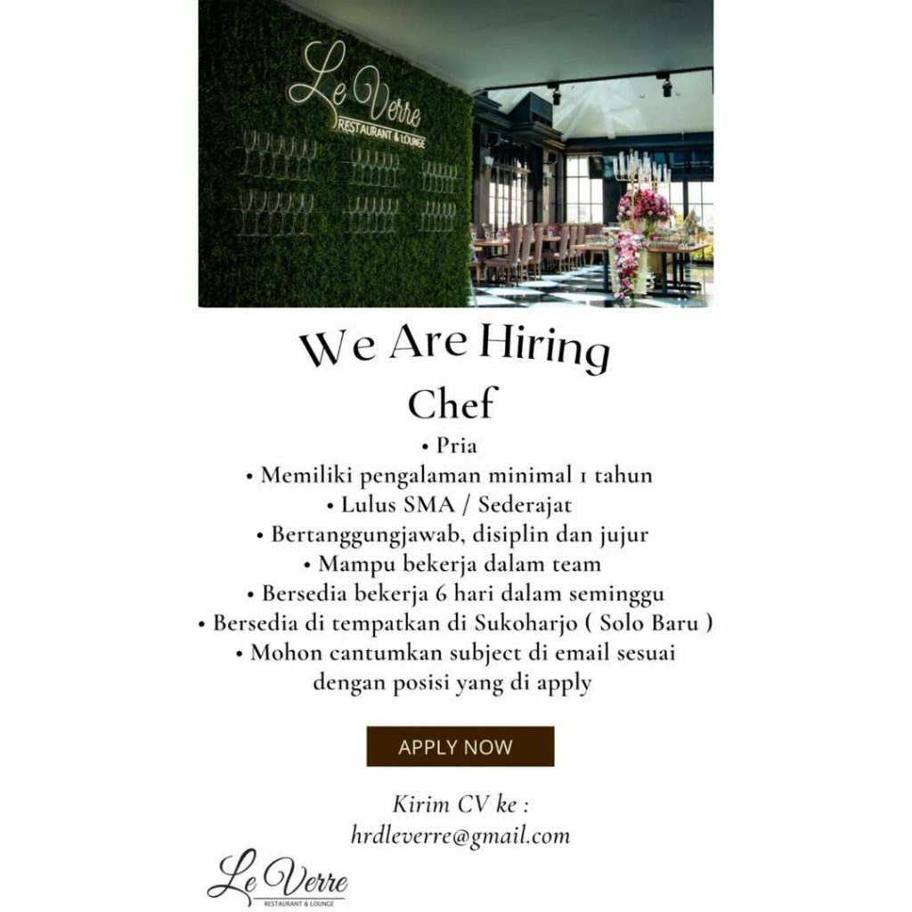 Sudah cek info Lowongan Kerja Juni 2022 Crew Outlet Le Verre Restauran Solo? Lowongan Kerja bisnis kuliner di Solo. Cari info loker solo terbaru? Cek sekarang juga….