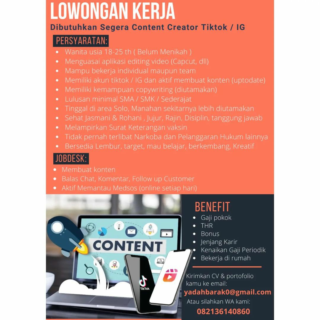 Saat ini kami membuka peluang bagi kalian yang berkompeten pada posisi content creator dalam bisnis yang kami kembangkan.