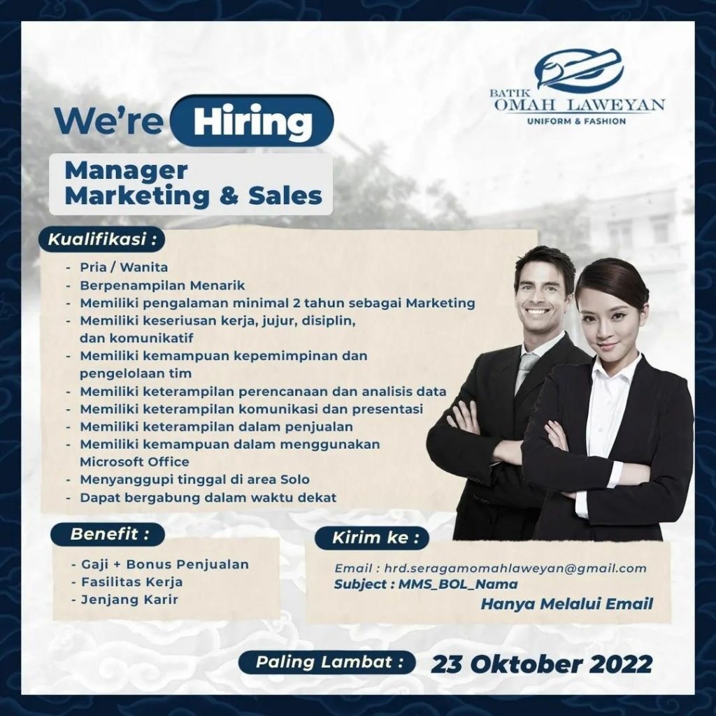 Sudah cek info Lowongan Kerja Oktober 2022 Sales Batik Omah Laweyan di Solo? Lowongan Kerja online shop di Solo. Cari info loker solo terbaru ? Cek sekarang juga….