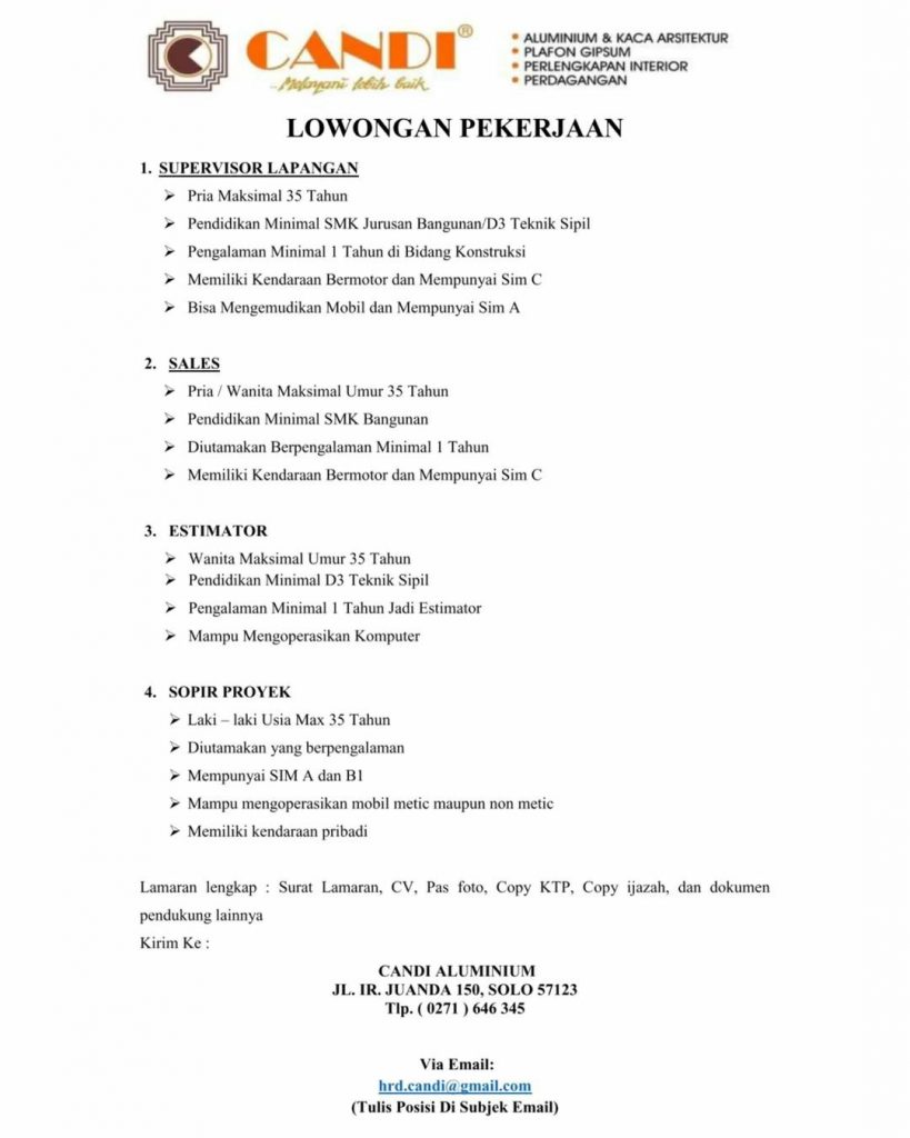 Lowongan pekerjaan November 2022 Candi Alumunium di Solo untuk posisi Supervisor berpengalaman. Peluang Kerja November 2022 Team Candi Alumunium di Solo dengan keahlian bisa komunikatif untuk bekerjasama serta menguasai bidang bisnis alumunium. Lowongan Kerja November 2022 Team Candi Alumunium di Solo untuk pria dan wanita domisili Surakarta dan sekitarnya. Segera kirim persyaratan lowongan pekerjaan ke Candi Alumunium di Solo. Info lebih lanjut lowongan kerja November 2022 Team Candi Alumunium di Solo hubungi melalui email: hrd.candi@gmail.com .