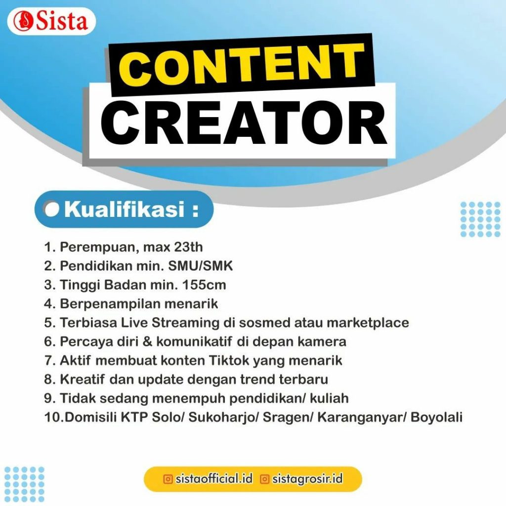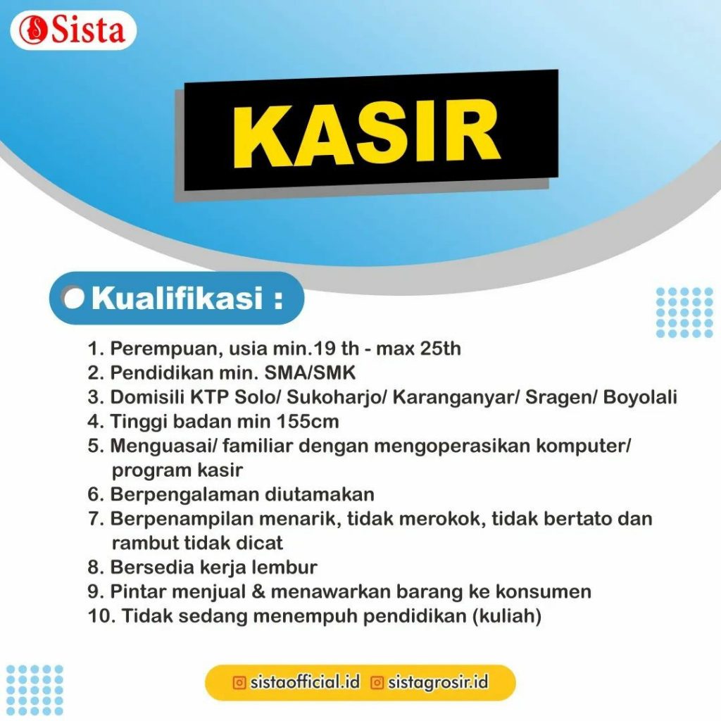 Sudah cek info Lowongan Kerja Desember 2022 Team Sista Group di Solo? Lowongan Kerja bisnis fashion di Solo. Cari info loker solo terbaru ? Cek sekarang juga….