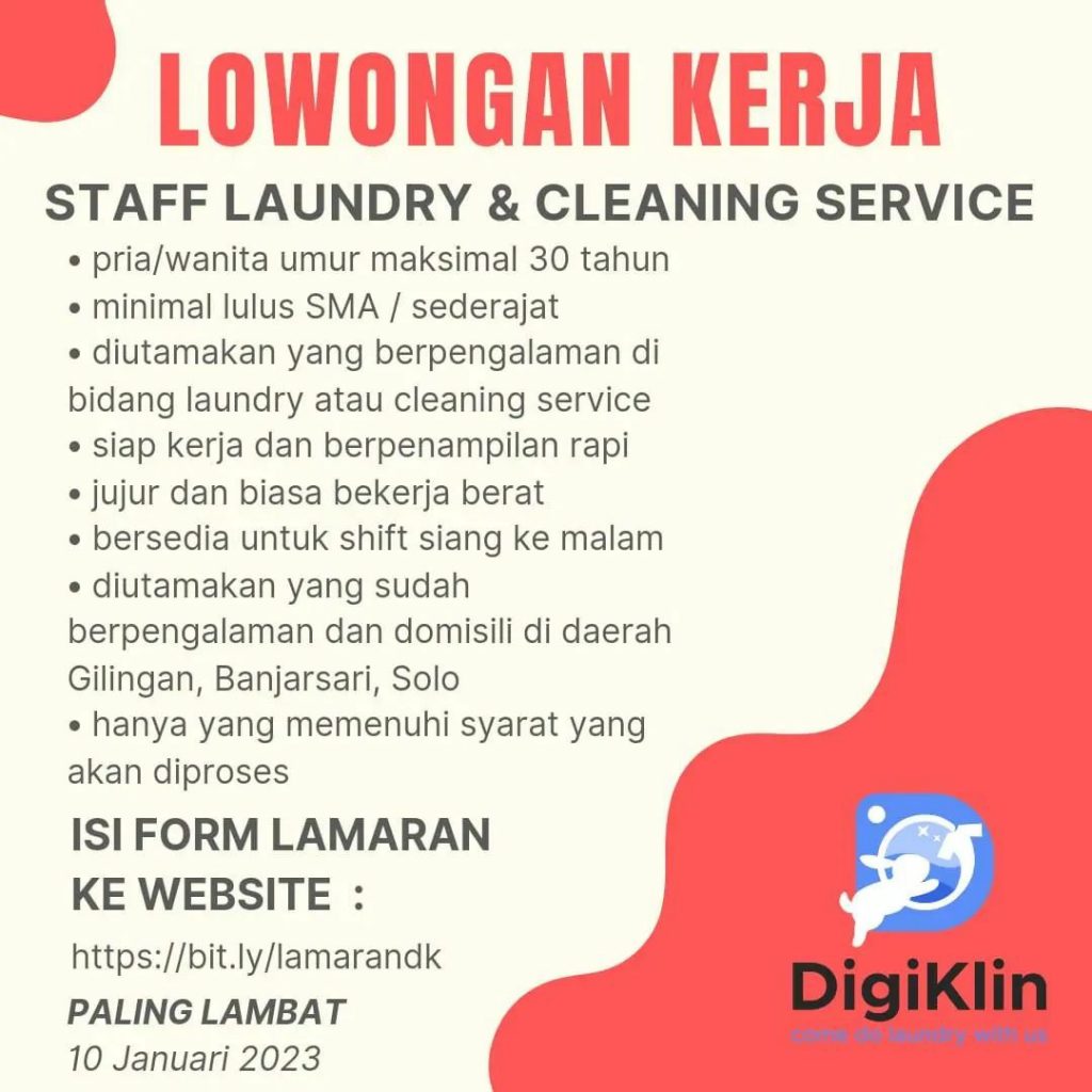 Lowongan pekerjaan Januari 2023 Digiklin di Solo untuk Crew Outlet berpengalaman. Peluang Kerja Januari 2023 Crew Outlet Digiklin di Solo dengan keahlian bisa komunikatif untuk bekerjasama serta menguasai bidang bisnis jasa laundry. Lowongan Kerja Januari 2023 Crew Outlet Digiklin di Solo untuk pria atau wanita domisili Surakarta dan sekitarnya. Segera kirim persyaratan lowongan pekerjaan ke Digiklin di Solo. Info lebih lanjut lowongan kerja Januari 2023 Crew Outlet Digiklin di Solo cek melalui link .