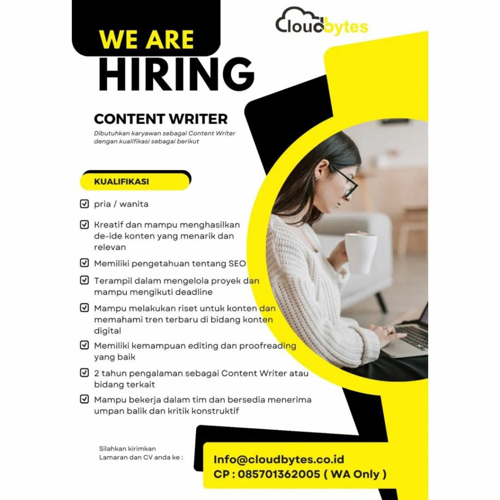 Lowongan pekerjaan Maret 2023 Perusahaan Cloudbytes di Solo untuk Content Writer berpengalaman. Peluang Kerja Maret 2023 Team Perusahaan Cloudbytes di Solo dengan keahlian bisa komunikatif untuk bekerjasama serta menguasai bidang bisnis jasa. Lowongan Kerja Maret 2023 Team Perusahaan Cloudbytes di Solo untuk pria atau wanita domisili Surakarta dan sekitarnya. Segera kirim persyaratan lowongan pekerjaan ke Perusahaan Cloudbytes di Solo. Info lebih lanjut lowongan kerja Maret 2023 Team Perusahaan Cloudbytes di Solo hubungi melalui email: info@cloudbytes.co.id dan hubungi melalui email: 0857-0136-2005.