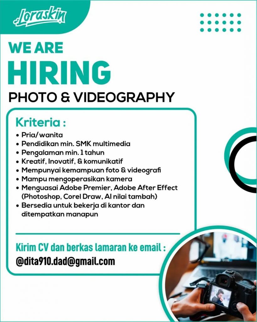 Lowongan pekerjaan April 2023 Loraskin di Solo untuk Content Strategist berpengalaman, Photographer berpengalaman, Videographer berpengalaman. Peluang Kerja April 2023 Content Strategist Loraskin di Solo dengan keahlian bisa komunikatif untuk bekerjasama serta menguasai bidang bisnis kecantikan. Lowongan Kerja April 2023 Content Strategist Loraskin di Solo untuk pria atau wanita domisili Surakarta dan sekitarnya. Segera kirim persyaratan lowongan pekerjaan ke Loraskin di Solo. Info lebih lanjut lowongan kerja April 2023 Content Strategist Loraskin di Solo hubungi melalui email: @dita910.dad@gmail.com .