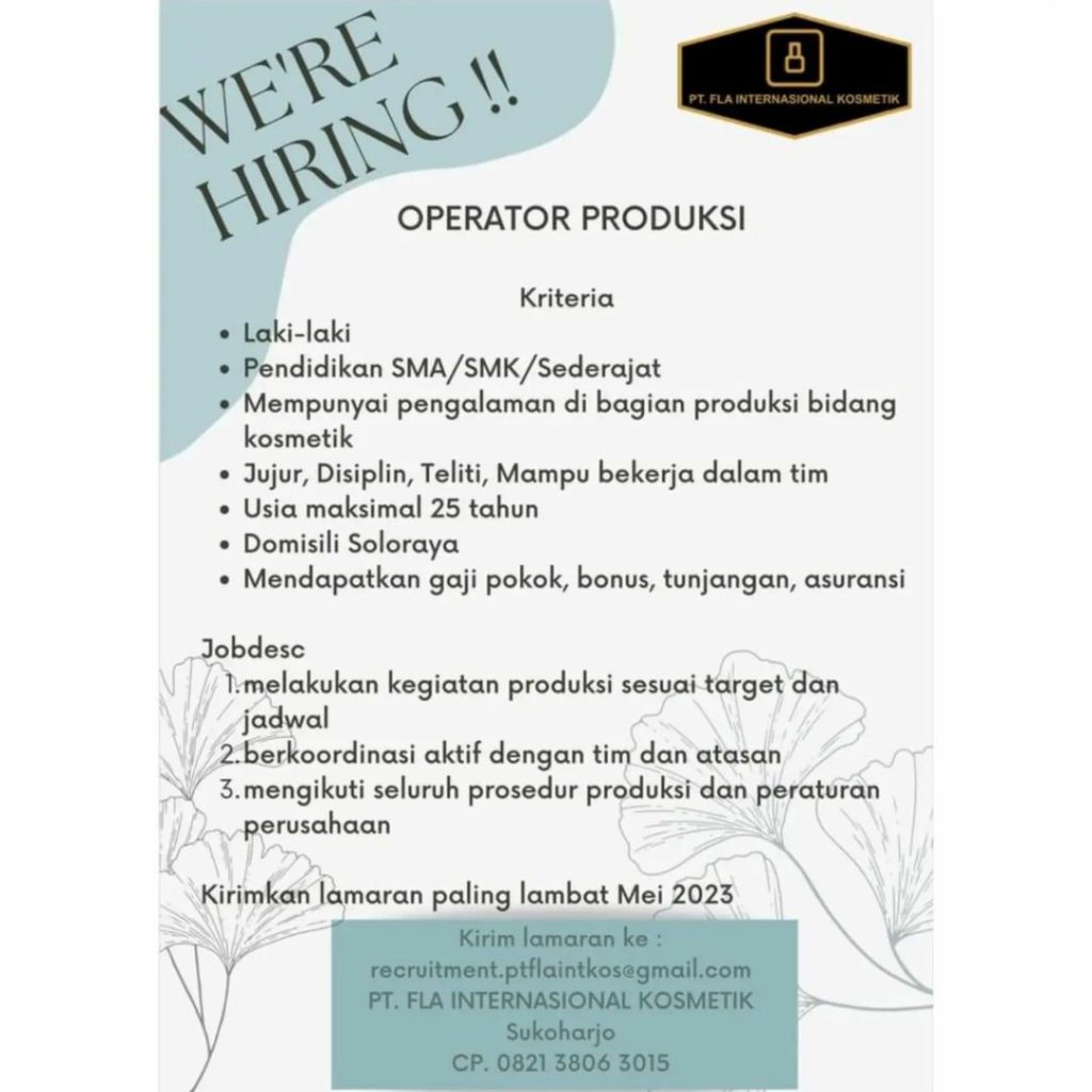 ????Loker April 2023 Operator Produksi PT Fla Internasional Kosmetik di Solo