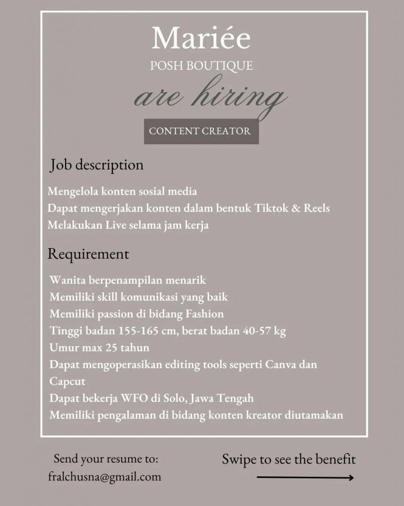 ???? Loker Juni 2023 Content Creator Mariee Posh Boutique di Solo