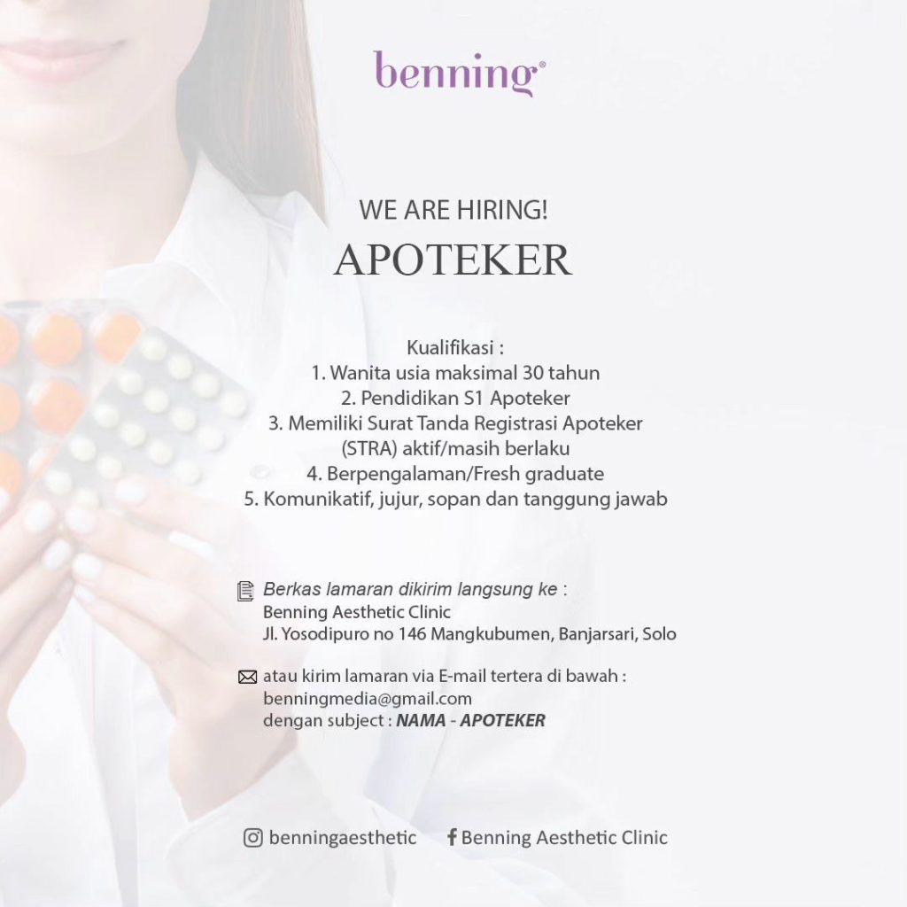 ????Loker Agustus 2023 Apoteker Benning Aesthetic Clinic di Solo