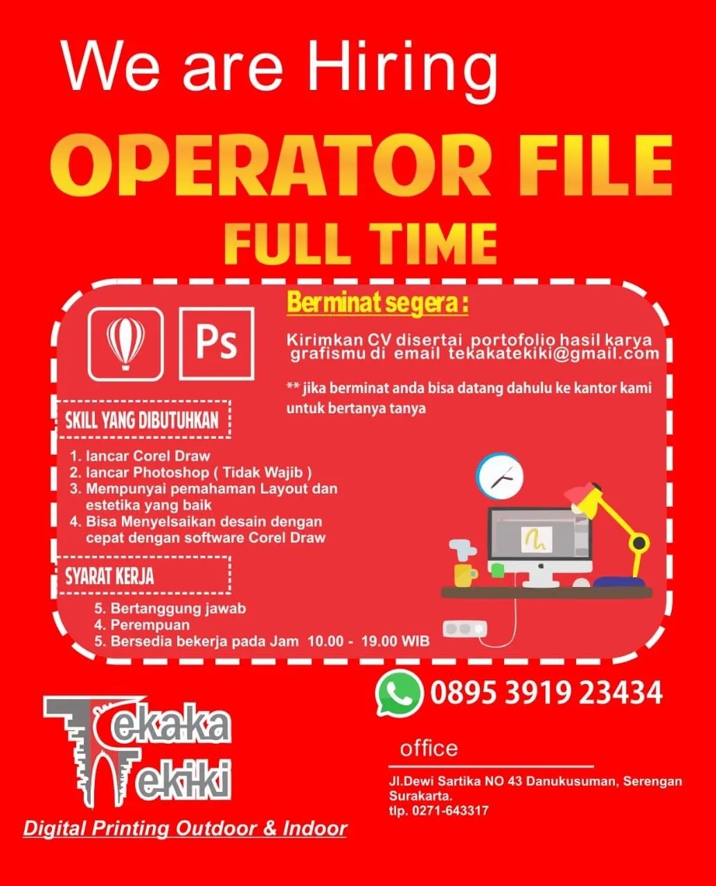 Sudah cek info Lowongan Kerja 2022 Fulltime Operator Tekaka Tekiki di Solo? Lowongan Kerja bisnis percetakan di Solo. Cari info…