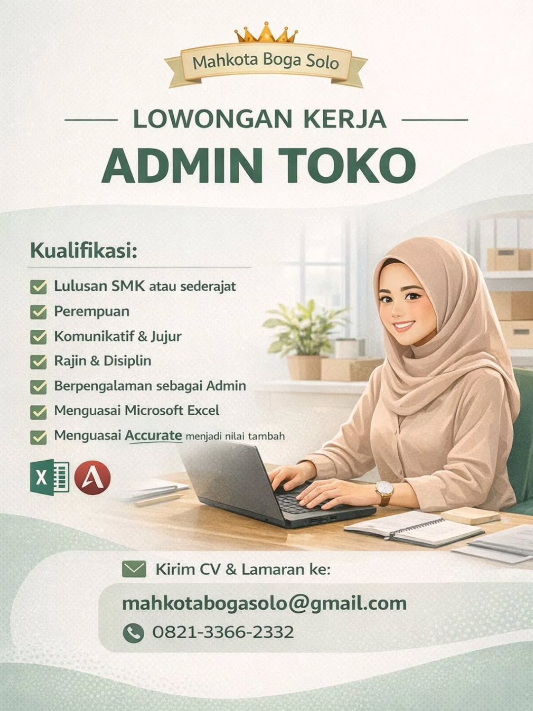 Lowongan Kerja Maret 2026 Admin Toko Mahkota Boga di Solo